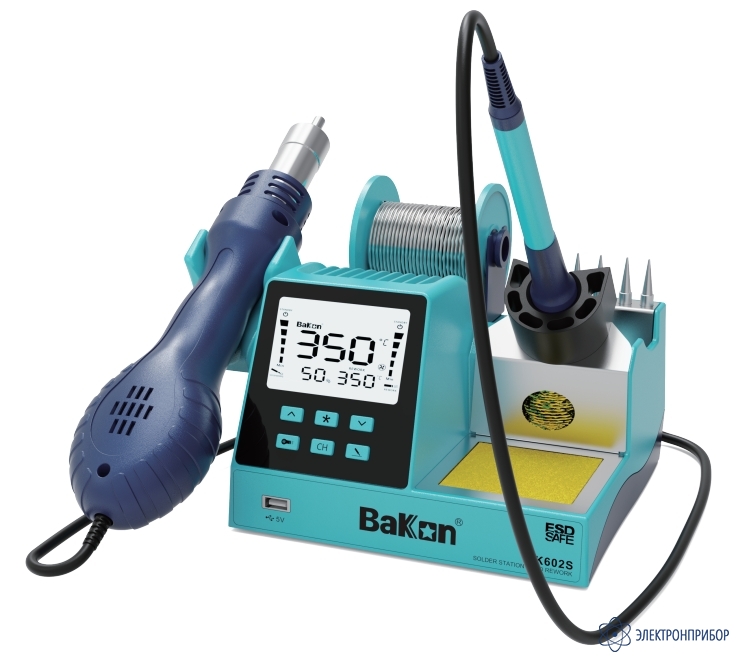 Эффективная комплексная паяльная станция BK602S с интегрированным термофеном и держателем для катушки BK602S. Станция имеет небольшие размеры и дисплей с большим экраном высокой четкости.