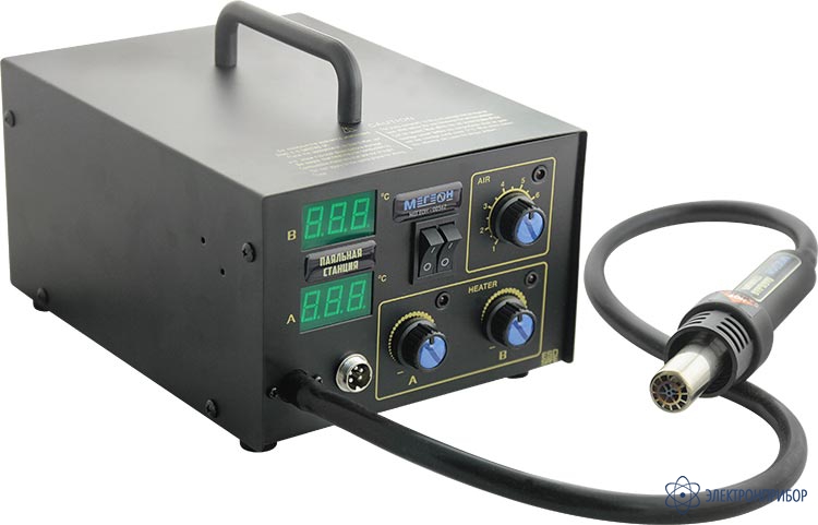 Паяльная станция с феном SMD МЕГЕОН 00562. Данная станция была создана с учетом экономии электроэнергии и вашего времени. Удобным является трансформация станции в паяльную станцию с электрическим жалом или в станцию, работающую горячим воздухом, а также комбинация этих двух функций для высокоэффективной работы. Быстрый нагрев и стабильная работа паяльной станции будут радовать пользователя повседневно. Возможность приобрести различные насадки и жала для паяльной станции МЕГЕОН 00562.