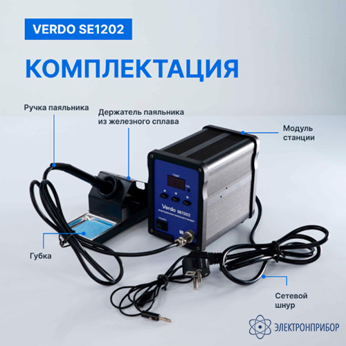 № Наименование Количество 1 Станция паяльная индукционная VERDO SE1202 1 2 Паяльник 1 3 Держатель паяльника 1 -