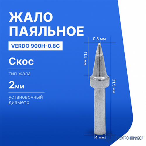 VERDO 900H-0.8C — паяльное жало конической формы со скосом, предназначенное для индукционных паяльных станций. Благодаря малому диаметру рабочей части — 0,8 мм — подходит для точных работ с мелкими компонентами на платах и обеспечивает удобство при пайке в узких местах и облегчает контроль количества припоя.