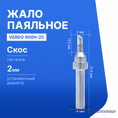 VERDO 900H-2C — паяльное жало, предназначенное для индукционных паяльных станций. Скошенная форма удобна для подключения крупных элементов, формирования перемычек и лужения проводов. Ширина рабочей части 2 мм — сбалансированный размер для средних SMD компонентов и выводных элементов, аккуратного нанесения припоя.
