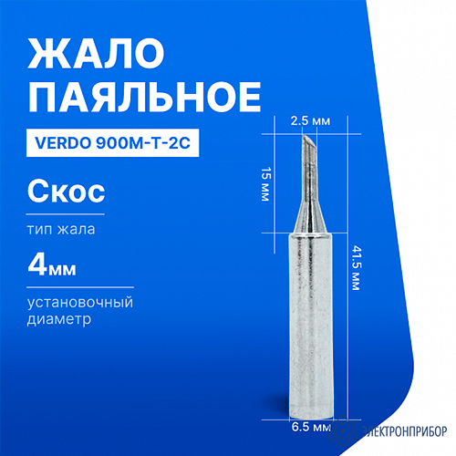 VERDO 900M-T-2C - представляет собой стержень диаметром 2 мм, усечённый под углом 45°. Благодаря использованию специального невыгораемого сплава, данное жало обеспечивает длительный срок службы и стабильную работу при высоких температурах.