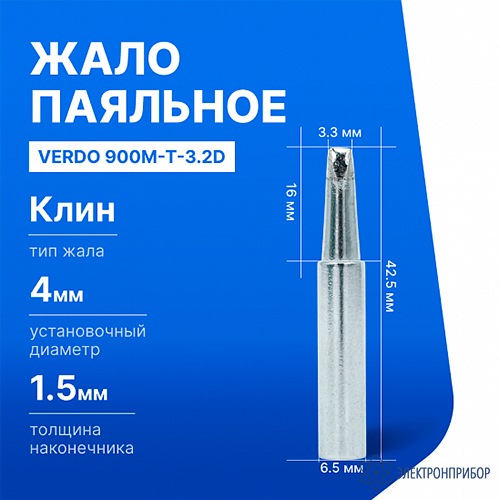 VERDO 900M-T-3.2D - клинообразное жало с диаметром рабочей части 3,2 мм. Благодаря использованию специального невыгораемого сплава, данное жало обеспечивает длительный срок службы и стабильную работу при высоких температурах.