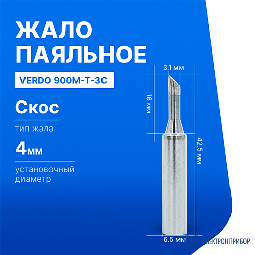 VERDO 900M-T-3C представляет собой стержень диаметром 3 мм, усечённый под углом 45°. Благодаря использованию специального невыгораемого сплава, данное жало обеспечивает длительный срок службы и стабильную работу при высоких температурах.