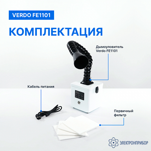 № Наименование Количество 1 Дымоуловитель VERDO FE1101 1 2 Первичный фильтр 3 3 Основной фильтр 1 4 Кабель питания 1 -