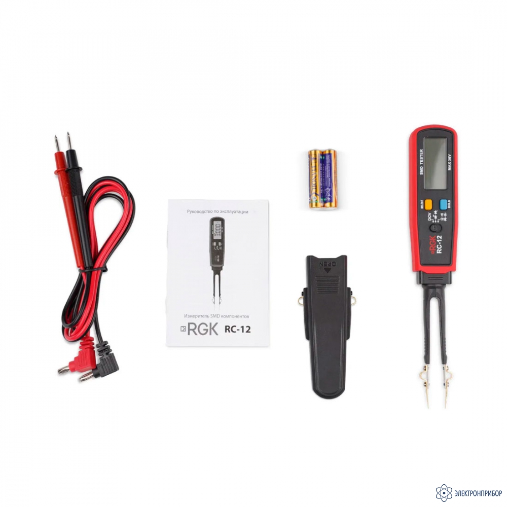 № Наименование Количество 1 Измеритель SMD компонентов RGK RC-12 1 2 Тестовые провода (комплект) 1 3 Запасные наконечники 2 4 Батарея 1,5 В (AAA) 2 5 Руководство по эксплуатации 1 -