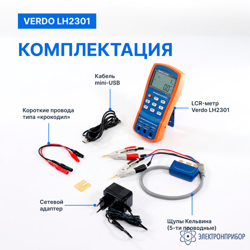 № Наименование Количество 1 LCR-метр портативный, 0,25%, до 100 кГц VERDO LH2302 1 2 Короткие провода со штекерами и зажимами типа крокодил (2 шт.) 2 3 5-ти проводной измерительный кабель с зажимами Кельвин 1 4 Пинцет-адаптер для SMD компонентов 1 5 Сетевой адаптер DC 12 В, 150 мА 1 6 Батарея 9 В типа «Крона» 1 7 Кабель mini-USB 1 -