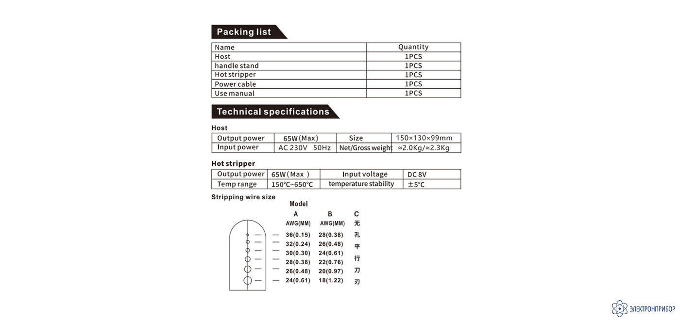 Параметр Значение Рабочее напряжение ~230 В / 50 Гц Диапазон температур 150 °C ~ 650 °C Максимальная выходная мощность 65 Вт Входное напряжение 8 В постоянного тока Стабильность температуры ±5 °C Размеры 150 х 130 х 99 мм Вес ≈ 2,0 / 2,3 кг -