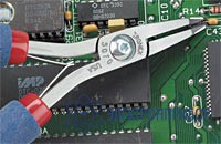 Маленькие концевые кусачки для работы с компонентами, поверхностного монтажа и радиомонтажных работ. Размеры режущих кромок (5,5 мм x 5 мм) . Тип среза: абсолютно плоский срез (Razor Flush). Длина губок 23 мм. Угол 16º. Режущая способность (мягкий медный провод) 0,1 мм-0,8 мм. Антистатические нескользящие ручки. Эргономичный размер ручек: длина 140 мм. Конструкция: система соединения состоит из двух элементов, соединенных между собой блокирующим винтом с мелкой резьбой, гайкой и прецизионно обработанными на станке опорными шайбами. Исполнение: высоколегированная сталь. Производство США.
