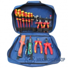 Набор инструментов состоит из 12 предметов: кусачки боковые, плоскогубцы, длинногубцы, отвертки крестовые, отвертки шлицевые, нож с защитной крышкой, клещи для снятия изоляции, измеритель напряжения.