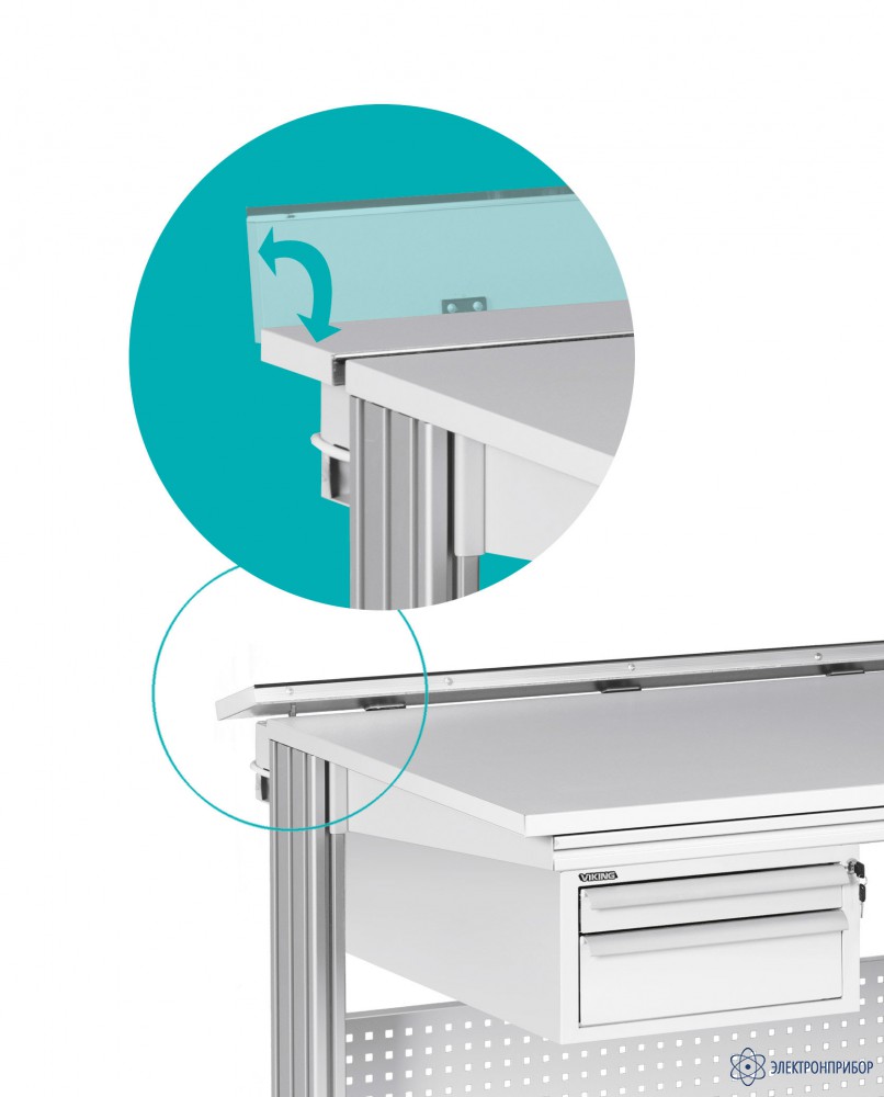Короб крепится к задней части стола, увеличивая его размер по глубине на 180 мм. Оснащен плавно закрывающейся крышкой с защитным ворсинками по краю. Внутри короба установлена электромонтажная панель с установленными в ней электрическими розетками, имеющими заземляющий контакт. В стандартной комплектации имеет 8 европейских розеток, автомат безопасности на 10 А, выключатель электропитания и трехметровый сетевой провод.