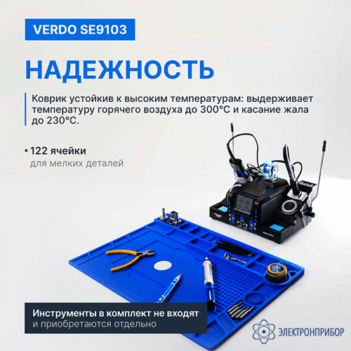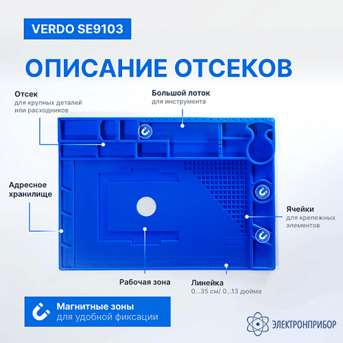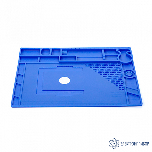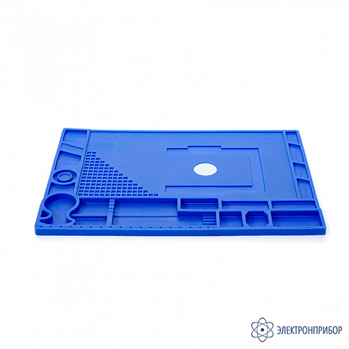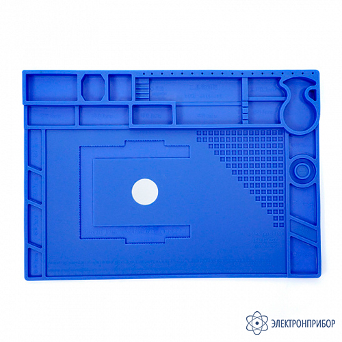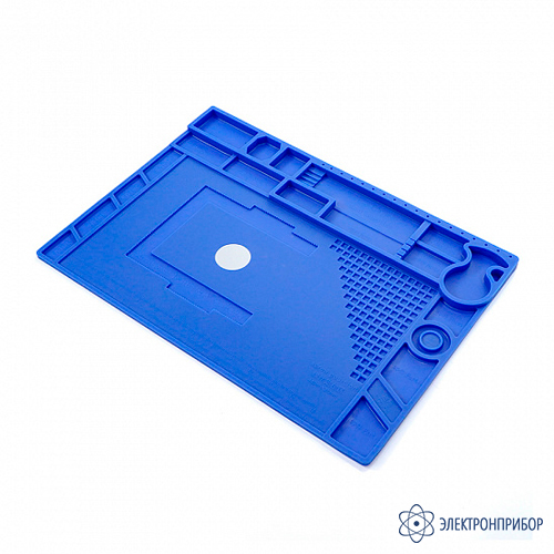 Коврик защищает стол от горячих капель припоя, а наличие ячеек для хранения винтов, запасных частей и инструментов помогает поддерживать порядок на рабочем месте. Некоторые ячейки оснащены магнитным основанием, что позволяет использовать их для удержания мелких металлических предметов. Легко очищается от пыли, остатков олова и других загрязнений.