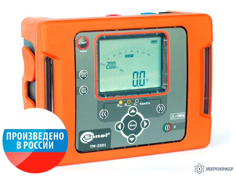 TM-2501 — цифровой мегомметр, предназначенный для измерения сопротивления изоляции кабельных линий, проводов, обмоток трансформаторов, двигателей, других электро- и телекоммуникационных установок. Максимальное измерительное напряжение составляет 2500 В постоянного тока, а диапазон измеряемого сопротивления ограничен величиной в 1000 ГОм. Установка трех интервалов времени позволяет автоматически рассчитывать коэффициенты абсорбции (увлажненности) и поляризации (старения). В процессе измерения сопротивления изоляции прибор отображает величину тока утечки.