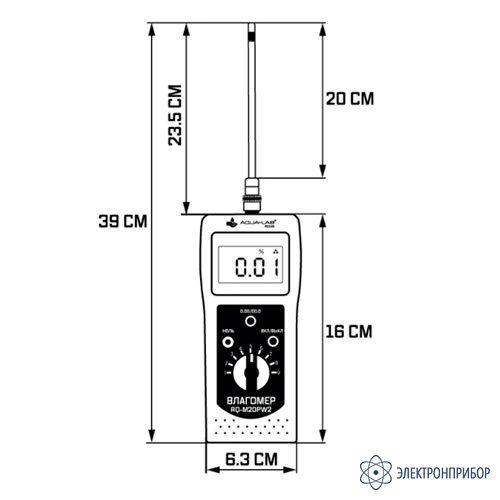 Исследование влажности порошкообразных материалов имеет свою специфику, так как должно производиться не только на поверхностных, но и нa глубинных слоях. Однако это недостижимо с помощью плоского датчика. Кроме того, для такого анализа крайне желательно применить технологию высокочастотного излучения, проникающего на глубину до 100 мм и более. Таким образом, влагомер AQUA-LAB AQ-M20PW2 можно назвать достаточно редким прибором-«гибридом», ведь он сочетает в себе лучшие качества игольчатых и СВЧ впагомеров. Модель AQUA-LAB AQ-M20PW2 представляет собой переносное цифровое устройство весом всего 200 г, снабженное внешним игольчатым сенсором (щупом), подключаемым к прибору посредством навинчивания. Отсутствие соединительного провода многократно повышает надёжность эксплуатации устройства.