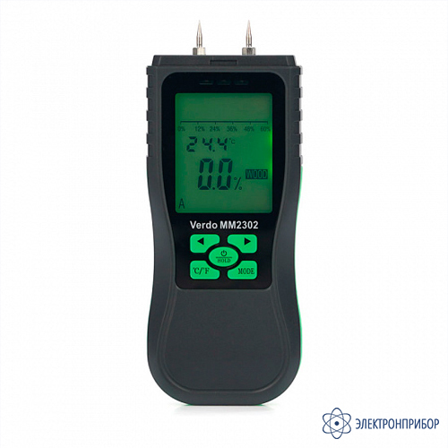 Влагомер древесины VERDO MM2302 предназначен для измерения относительной влажности древесины (8 шкал) и строительных материалов. В приборе реализован кондуктометрический метод измерения. Влагомер VERDO MM2302 имеет эргономичный корпус и оснащен большим ЖК-дисплеем с подсветкой для удобного считывания показаний. Прибор дополнительно оснащен функцией измерения температуры окружающей среды. Питание влагомера осуществляется при помощи 2 шт. батарей типа ААА.