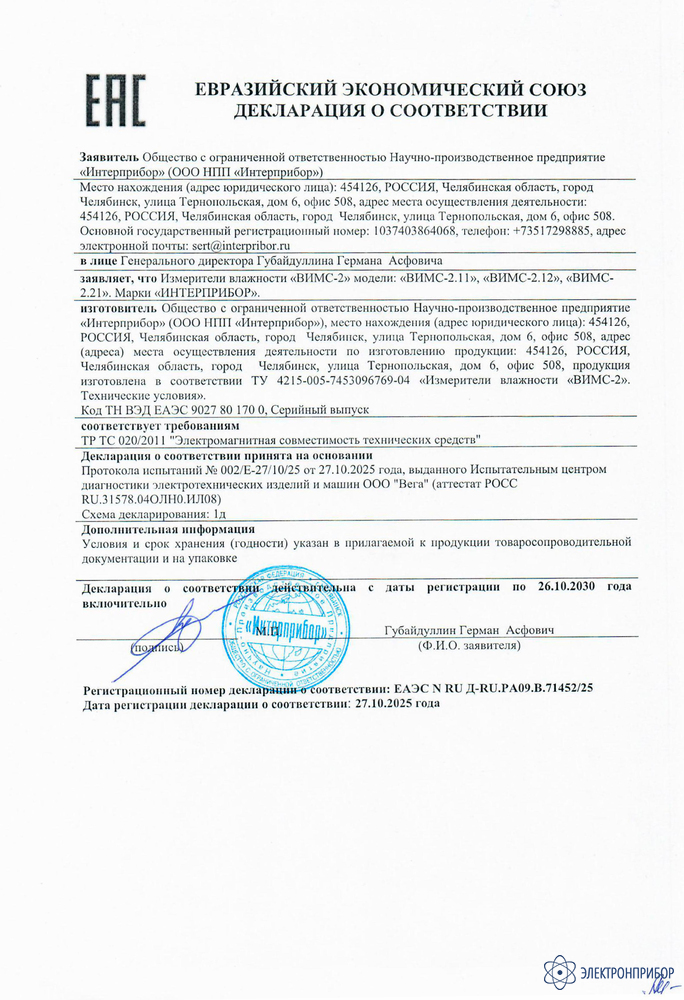 № Наименование ВИМС-2.21 исполнение 1 ВИМС-2.21 исполнение 2 ВИМС-2.21 исполнение 3 1 Блок электронный ВИМС-2.2 1 1 1 2 Чехол 1 1 1 3 Датчик объемно-планарный 1 1 - 4 Датчик зондовый 1 - 1 5 Зарядное устройство USB (1А) 1 1 1 6 Кабель USB 1 1 1 7 Сумка (при комплектации Кейсом не поставляется) 1 1 1 8 Методика поверки МП 101-243-2009 1 1 1 9 Программа связи с ПК на "Flash-визитке" 1 1 1 10 Руководство по эксплуатации (Совмещает паспорт прибора. На поверенный прибор в паспорте ставится отметка о проведение поверки, на которой нанесен знак поверителя, присутствует подпись поверителя и указана дата проведения поверки)* 1 1 1 *С 24.09.2020 в комплект поставки поверенных приборов не входит метрологическое свидетельство. По письменному запросу возможно предоставление отдельного метрологического свидетельства со сроком изготовления в течение месяца с момента готовности прибора к отгрузке.