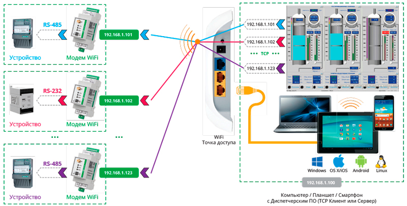 - Со стороны диспетчерского ПО: Windows, Linux, Android, OS X, iOS – по TCP.