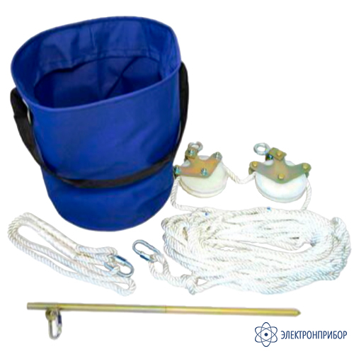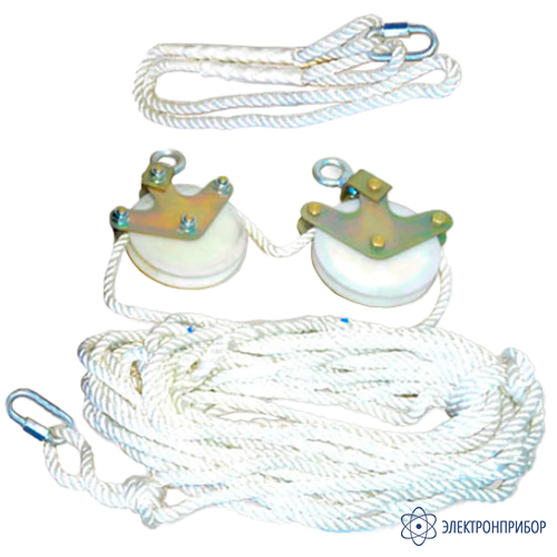 Таким образом заправленный в ролики блоков бесконечный канат образует транспортировочную линию для подъема различных грузов на необходимую высоту. Концы бесконечного каната сплетены между собой, для закрепления ведра монтажника или других поднимаемых деталей на канате имеется петля для крепления груза, завязанная узлом «австрийский проводник». При необходимости его можно развязать и перевязать в другом месте бесконечного каната. Для регулировки длины каната на противоположной ветви бесконечной петли можно завязать дополнительный (регулировочный) узел «австрийский проводник».