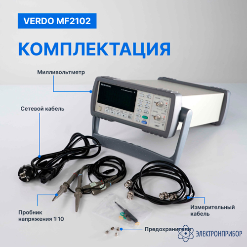 № Наименование Количество 1 ВЧ-милливольтметр 2-канальный, 5 МГц VERDO MF2102 1 2 Сетевой кабель 1 3 Измерительный кабель 1 4 Пробник напряжения 1:10 2 5 Предохранитель 2 -