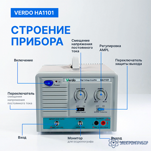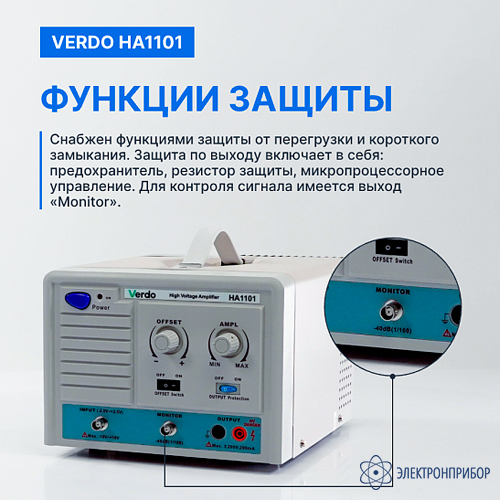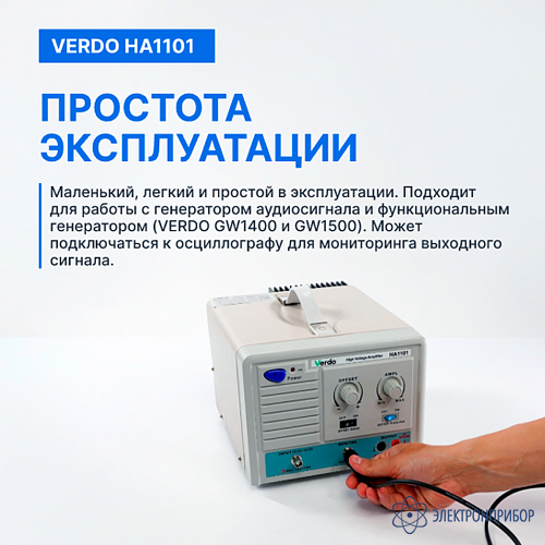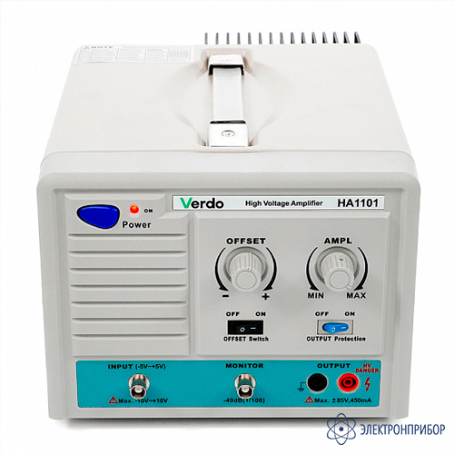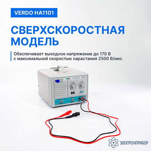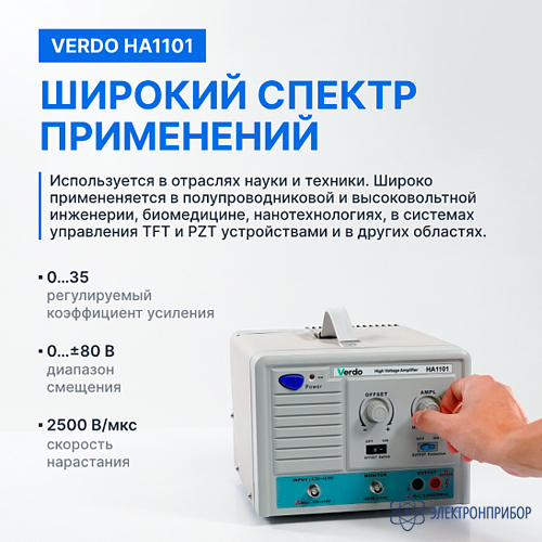 VERDO HA1101 представляет собой компактный высоковольтный усилитель, предназначенный для применения в испытательной и измерительной технике. Устройство отличается небольшими габаритами, малым весом и простотой в эксплуатации. Максимальное выходное напряжение составляет 170 В (размах).