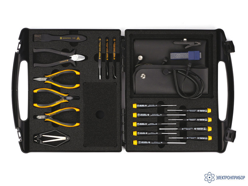 № Наименование Количество 1 Заземляемый коврик с браслетом 1 2 Металлический пинцет с ESD-покрытием рукояток 5-049-13 1 3 Металлический пинцет с ESD-покрытием рукояток 5-055-13 1 4 Металлический пинцет с ESD-покрытием рукояток 5-059-13 1 5 Прецизионные кусачки 3-651-15 1 6 Мощные кусачки для жестких работ 3-133-13 1 7 Прецизионные плоскогубцы 3-682-15 1 8 Щипцы 3-683-15 в исполнении Euroline 1 9 Отвертка плоская (шлиц) 4–601 1 10 Отвертка плоская (шлиц) 4–603 1 11 Отвертка плоская (шлиц) 4–605 1 12 Отвертка крестовидная 4–621 1 13 Отвертка крестовидная 4–622 1 14 Отвертка крестовидная 4–623 1 15 Отвертка TORX (звездочка) 6–661 1 16 Отвертка TORX (звездочка) 6–662 1 17 Отвертка TORX (звездочка) 6-663L 1 18 Экстрактор микросхем PLCC 2–620 1 19 Кисточка 7–422 1