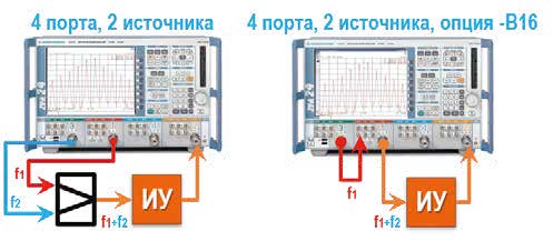 Интермодуляционные измерения также позволяют оценить нелинейные свойства ИУ. Измерения выполняются с двумя ВЧ сигналами, имеющими одинаковую мощность, но разные частоты, которые называются верхним и нижним тонами. В зависимости от конфигурации прибора, могут применяться различные схемы измерений, например, с внешним сумматором или с использованием прямого доступа (опция -B16).