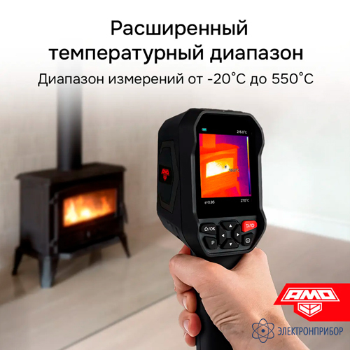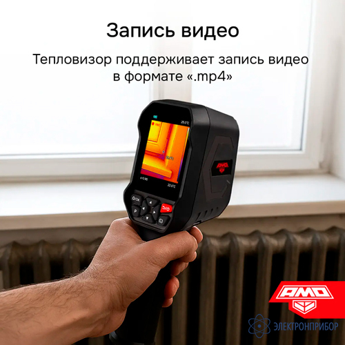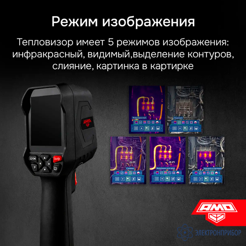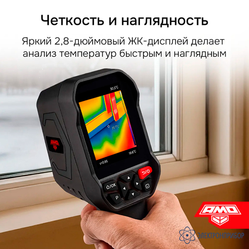 Конструкционные и функциональные особенности. Разработанный для оперативного контроля, тепловизор AMO T832 выполнен в "пистолетном" форм-факторе с оптимизированным расположением органов управления для работы одной рукой, что упрощает ИК съемку в сложных условиях. Встроенная светодиодная подсветка позволяет выполнять термографирование даже в полной темноте. Доступ к настройкам и режимам производится через интуитивно понятное меню, с помощью навигационных клавиш. Для быстрого вызова наиболее востребованной функции предусмотрена возможность программирования пользовательской кнопки "P".