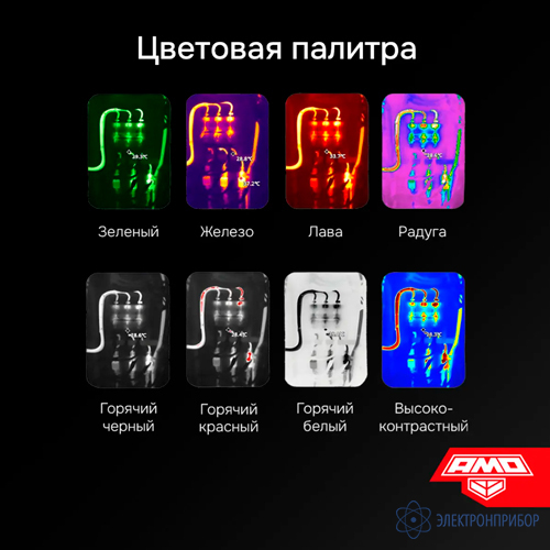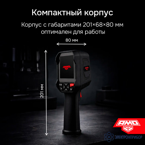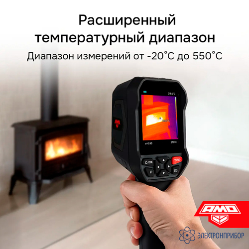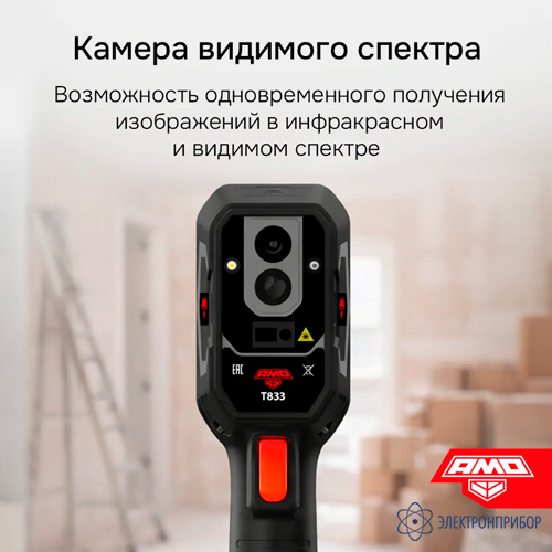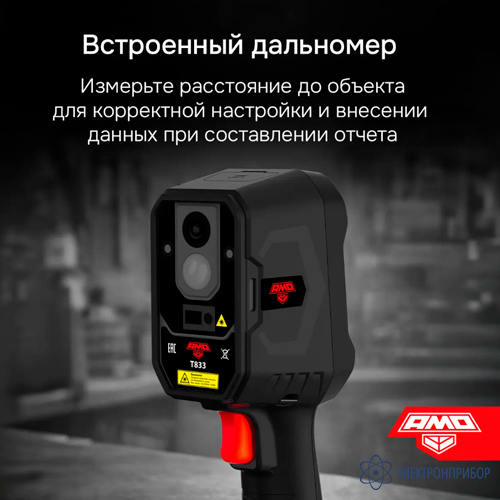 Функциональные возможности. Технический тепловизор AMO T833 позволяет контролировать температуру в центральной точке экрана, в месте, на которое указывает лазерный маркер, или в выбранной зоне. Для повышения точности предусмотрена возможность коррекции показаний с учетом коэффициента отражения цели и дистанции до нее. Поддерживается функция настраиваемой звуковой сигнализации и автоматических маркеров для температурных максимума и минимума. Встроенный фонарик обеспечивает подсветку рабочей зоны при работах в темноте.