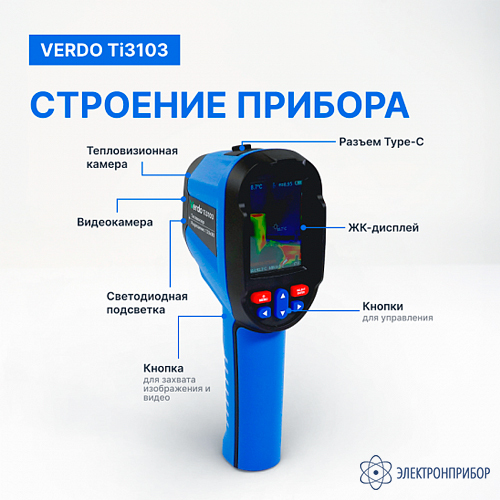 Тепловизор VERDO Ti3103 прибор представляет собой инфракрасную камеру, которая объединяет измерение температуры поверхности и тепловизионное изображение в режиме реального времени. Кроме того, центральный измерительный курсор используется для быстрого и точного определения местоположения для измерения температуры целевого объекта. Тепловизор оснащен камерой видимого света.