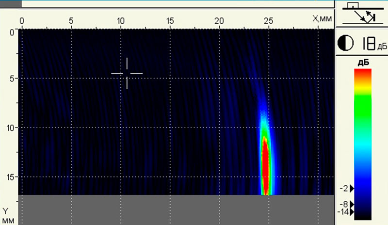 После обнаружения дефектов обеспечивается возможность оценки их реальных размеров с помощью курсора, перемещаемого в трех координатах (расстояние, длина, глубина), что существенно упрощает получение информации о месте расположения и протяженности выявленных дефектов.
