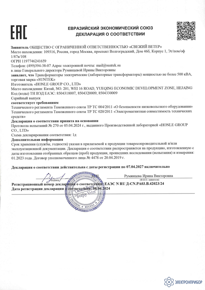 № Наименование Количество 1 Автотрансформатор ЛАТР однофазный 0-300 Вольт (40А) SUNTEK 10000ВА 1 2 Паспорт 1 -