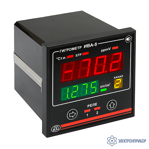 - ИВА-8/ДТР-2-СМ — гигрометр в щитовом исполнении 72х72 мм, до 2 каналов измерения точки инея, диапазон измерения от -80 до 0°С, установочная резьба преобразователя М24×1, рабочее давление до 10 МПа. Базовая комплектация - 1 канал влажности, 2 релейных выхода, транспортный колпачок с осушителем.
