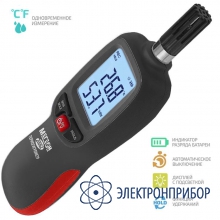 Параметр Температура Относительная влажность Точка росы Мокрый термометр Диапазон измерения -20 ... 70°С (-4 ... 158°F) 0 ... 100% -20 ... 50°С -20 ... 50°С Разрешение 0,1°С 0,1% 0,1°С 0,1°С Погрешность измерений ±1°С (в диапазоне 5 ... 70°С) ±4% (при 25 °С в диапазоне 10 ... 90%) В других условиях ±5% ±2°С (в диапазоне 5 ... 50°С и относительной влажности 10 ... 90%) Максимальное время отклика 30 секунд Питание Батарея 1,5 тип ААА - 3 шт. Условия эксплуатации Температура: 0 ... 45°С Относительная влажность: не более 85% Условия транспортировки и хранения Температура: -20 ... 60°С Относительная влажность: не более 85% без выпадения конденсата. Размер 180 х 56 х 36 мм Вес 130 г с батарейками -