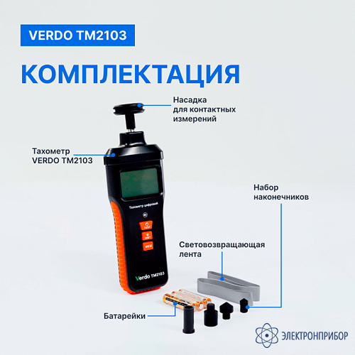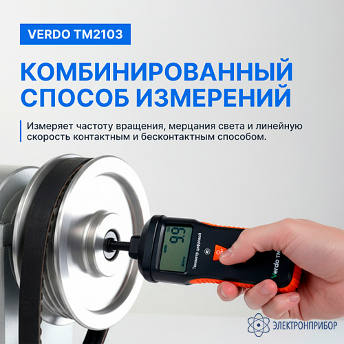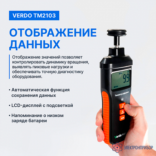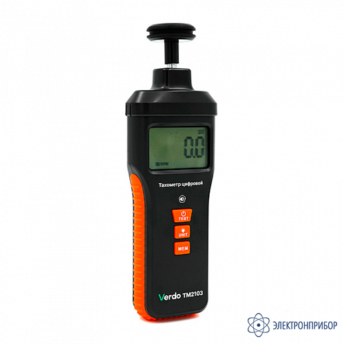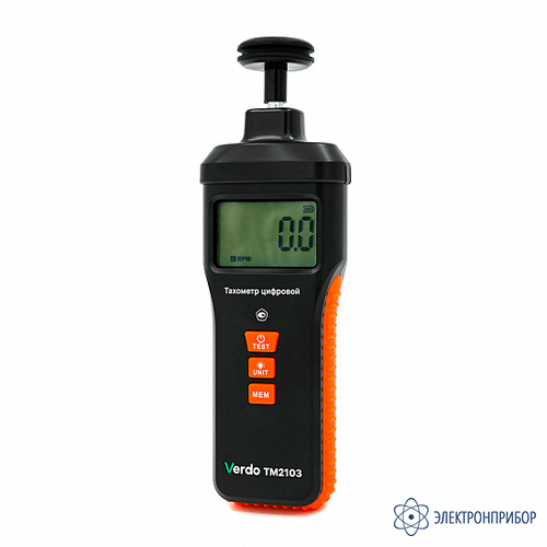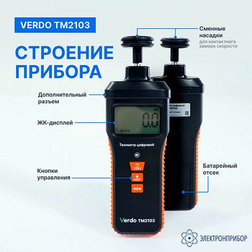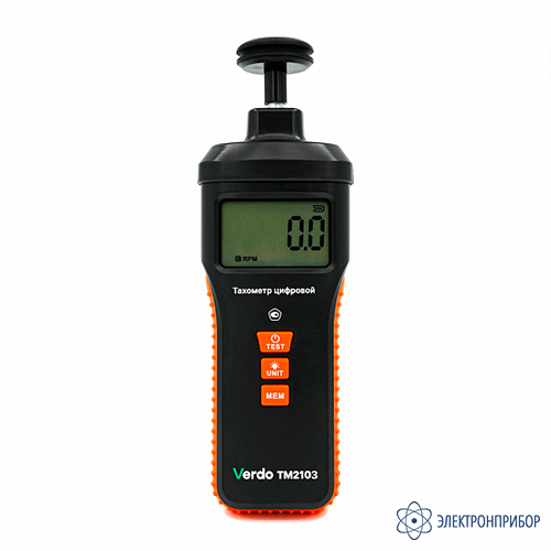 Тахометр Verdo ТМ2103 предназначен для измерения частоты вращения, частоты мерцания источника света и линейной скорости перемещения как контактным, так и бесконтактным (комбинированным) способом. Принцип работы основан на подсчёте импульсов от датчика с последующим выводом информации на дисплей. Прибор имеет портативный пластмассовый корпус с дисплеем и кнопками управления, внутри расположен микропроцессор, АЦП и датчик подсчёта оборотов.