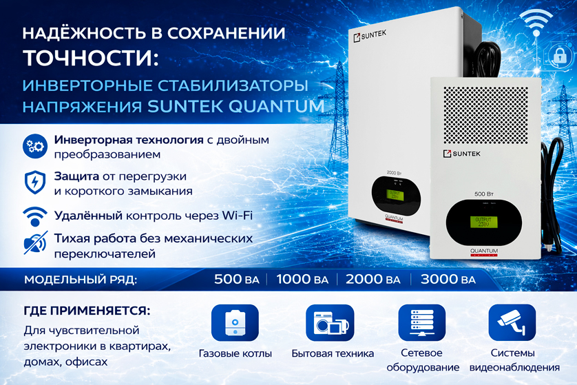 Сегодня на рынке представлено множество моделей стабилизаторов. Однако если внимательно рассмотреть требования современной техники — точность напряжения, стабильность питания и безопасность — становится очевидно, что лучше всего с этими задачами справляются устройства нового поколения. Именно к таким решениям относится серия SUNTEK QUANTUM.